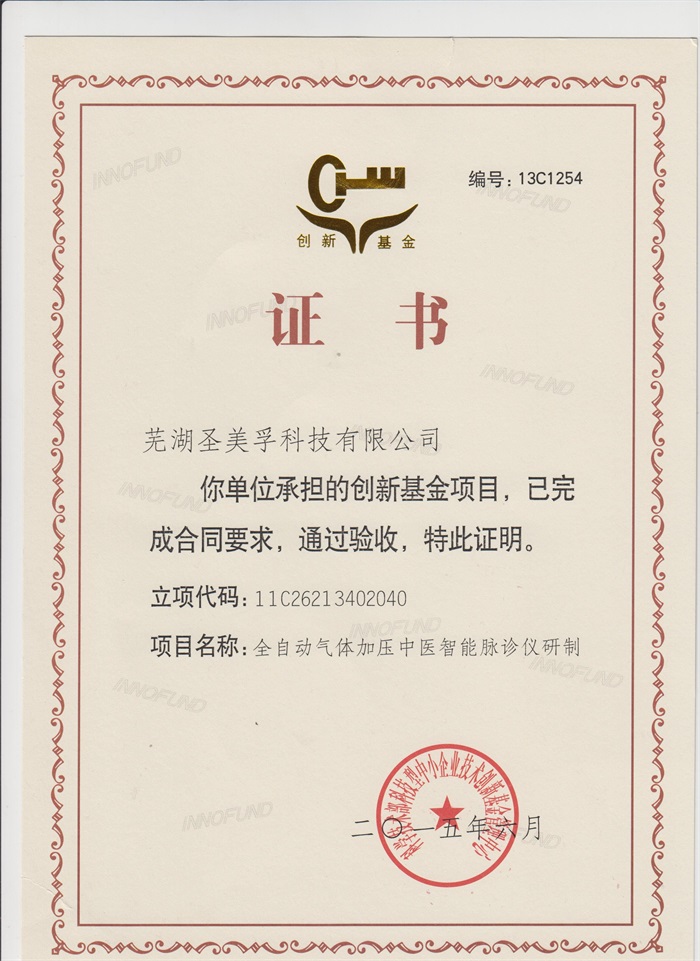 全自動氣體加壓中醫(yī)智能脈象儀研制創(chuàng)新基金項目驗收證書